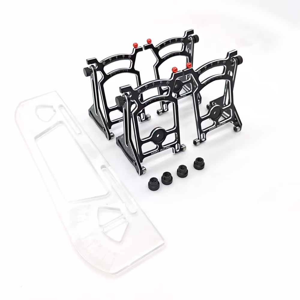 Crafted from CNC-machined, hard-coated 6061 aluminum, the main setup frame offers exceptional rigidity and longevity. The CNC-machined, tough acrylic toe/steering scale measurement plate provides a clear and accurate reference. All scales and markings are precisely engraved, delivering instant, reliable readings that are easy to read.