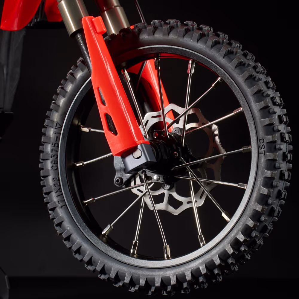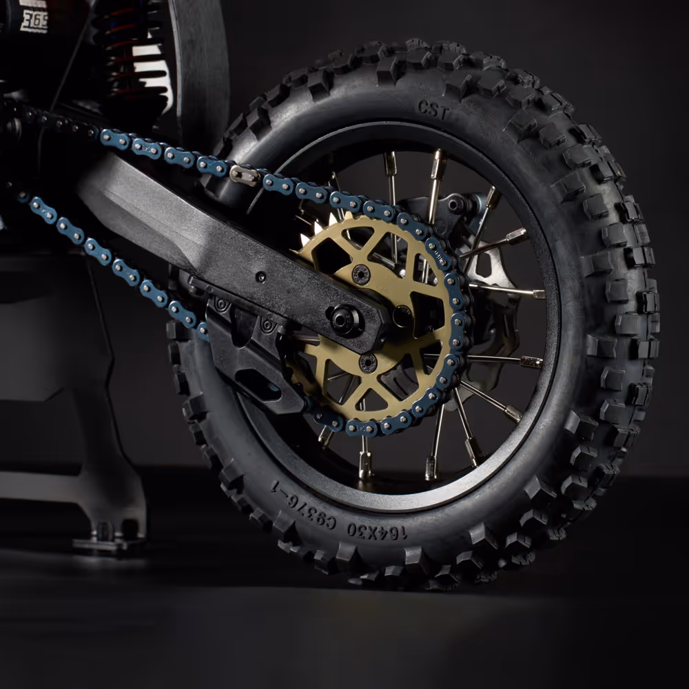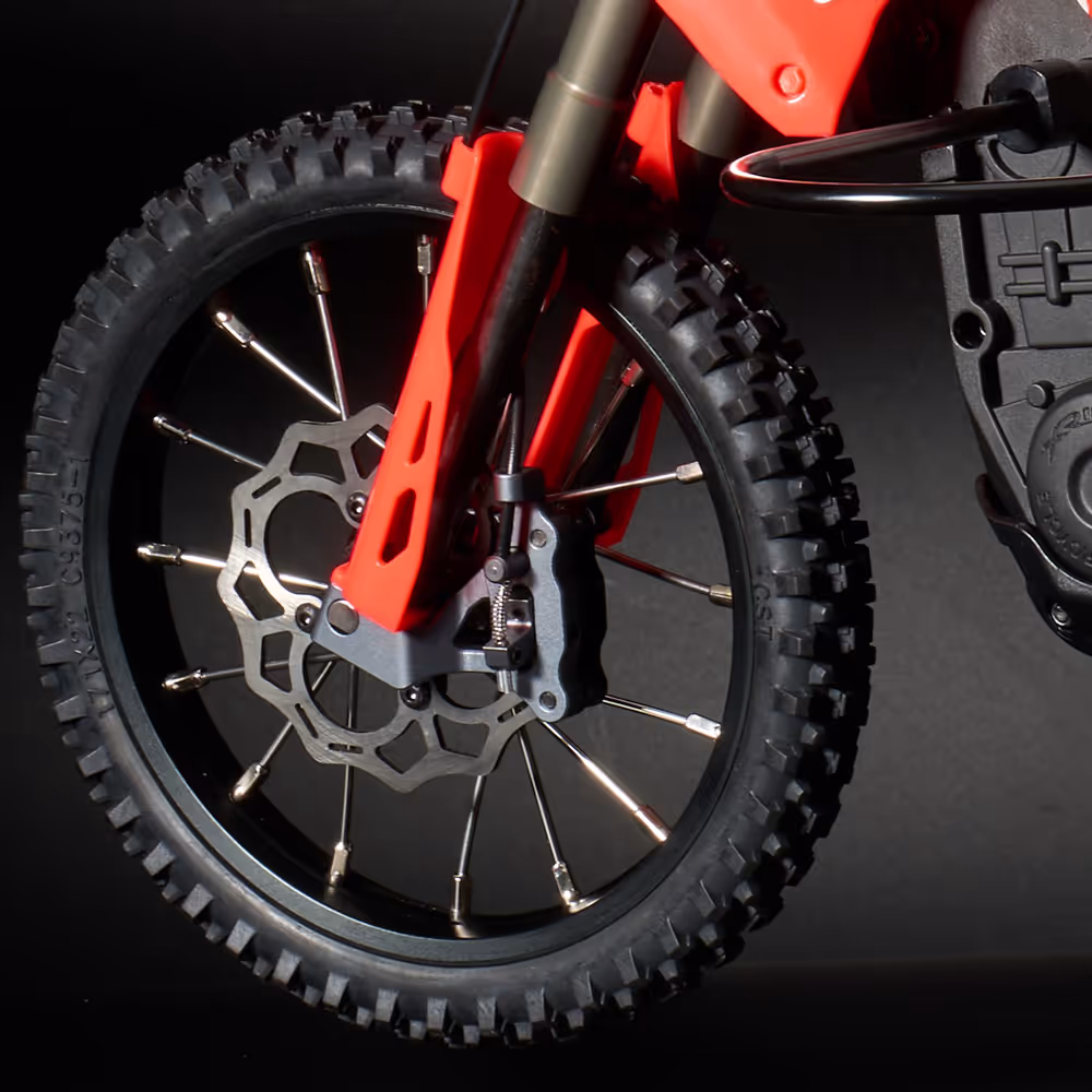 - Premium Wheel & Tire Setup: Features visually stunning, spoke-braided black anodized aluminum wheels and hubs, adding to its authentic scale look and extreme durability. Fitted with high-performance, ultra-narrow CST (Cheng Shin Tire) rubber tires, a leading 1:1 tire industry producer, ensuring stable running and exceptional grip.