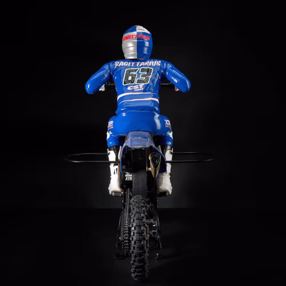 XRider Sagittarius SG4001 is a 1:4 scale remote control off-road motorcycle that brings the thrill of motocross to your fingertips. Designed to replicate a full-scale MX motorcycle, this model features a meticulously crafted body and a dynamic rider figure in an aggressive riding stance, delivering an authentic and immersive experience. Powered by a high-performance 3652 / 3800KV brushless motor and equipped with an 80A HobbyWing ESC, Sagittarius offers exceptional speed and control. Its innovative hidden front-mounted flywheel gyro lowers the center of gravity, reducing unsprung weight for improved jumping, turning, and acceleration. Paired with CST tires and alloy spoke wheels, this RC motorcycle ensures stable, high-performance handling on any terrain, making it a must-have for RC enthusiasts and collectors.